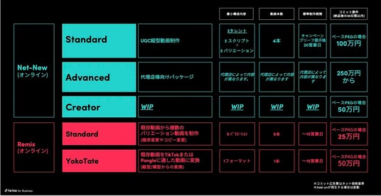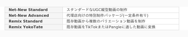 TTCXには以下の提供パッケージがあり、クリエイティブの構成内容や動画本数などの条件に応じて選択できます。
