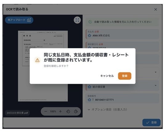 重複した領収書をアップロードした場合、自動でAIが検知してアラートを出します。