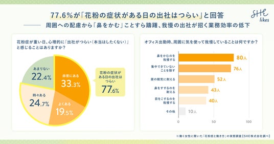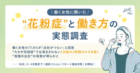 学ぶから働くまでを支援する女性向けキャリアスクール「SHElikes(シーライクス)」を運営するSHE株式会社(所在地:東京都港区、代表取締役CEO/CCO:福田恵里、以下SHE)は、働く女性228名を対象に「花粉症と働き方に関する実態調査」を実施いたしました。