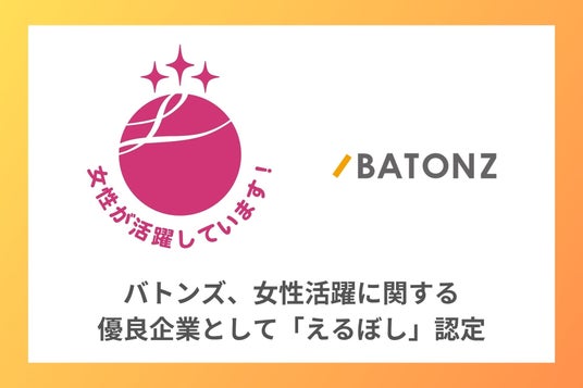 M&A・事業承継支援プラットフォーム「BATONZ(バトンズ)」を運営する株式会社バトンズ(本社:東京都中央区、代表取締役CEO:神瀬 悠一、以下バトンズ)は、女性活躍推進に優れた企業として、厚生労働省より「えるぼし」認定の最高位である3つ星を取得しました。
