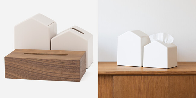 一般的なティッシュボックスを置く面積にMoiのティッシュケースとダストボックスの両方を並べることができます。2つセットで並べると「おうち」が2棟建ったようなかわいい見た目に。