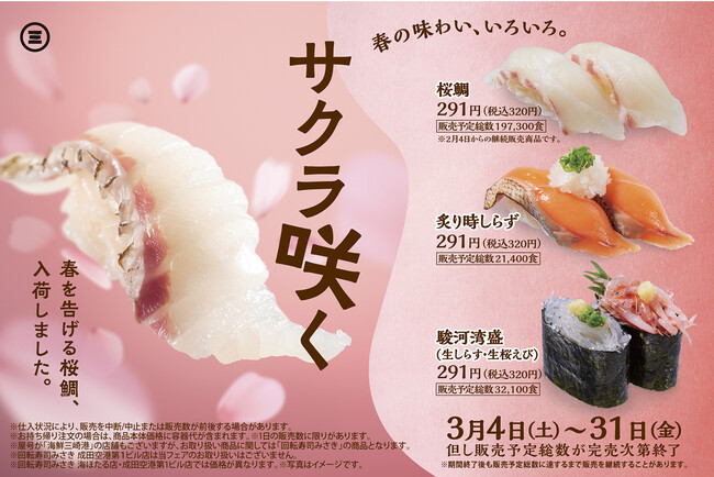 「回転寿司みさき」では、その時々の旬の魚介やこだわりの寿司を味わっていただくべく、毎月、期間限定でフェアを実施しています。3月4日(土)からは、桜の咲く季節に水揚げされる「桜鯛」をはじめとした、季節限定商品をご用意しております。鮮度にこだわって仕入れた「桜鯛」に、駿河湾産の生しらすと生桜えびを味わえる「駿河湾盛(生しらす・生桜えび)」、さらに、ほんのり脂がのった時しらずを塩〆し、店舗で提供直前に皮目を炙ることで脂の旨味を引き出した「炙り時しらず」も登場します。春を感じていただける一皿を、ぜひ「回転寿司みさき」で見つけてみてください。