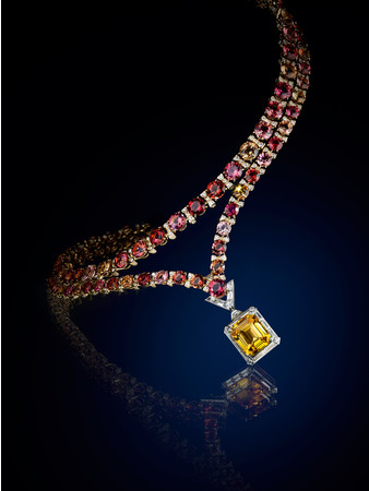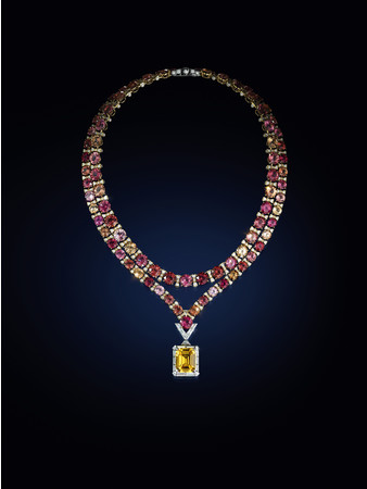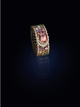 このネックレスとコーディネートされるのは、20.67カラットのオーバルカットのピンクトルマリンを主役とするカフブレスレット。比類なきカラーレンジのカラーストーン60個が、ルイ・ヴィトンのシグネチャーである錠前に光のシャワーを浴びせています。