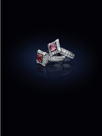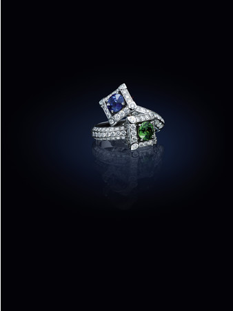 ルイ・ヴィトンは3年の歳月をかけて、そうした比類なきクオリティのストーンを見出しました。ダイヤモンドのパヴェで覆われ、ジオメトリックにセッティングされているのは、見事なまでにピンク色に染まった1.30カラットのマダガスカル産パパラチアサファイア、目が覚めるほど鮮やかな1.34カラットのモザンビーク産ルビー、2.09カラットのマダガスカル産サファイア、1.34カラットの濃厚なヴィヴィッドグリーンのデマントイドガーネット。どれも華麗で洗練されたリングであり、スタッズやアングルマウントといった、トランクのシルエットを連想させる凝ったディテールで飾られています。これらのリングは、単体で着用することも、重ね着けで楽しむこともできます。