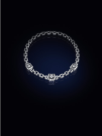 今回唯一のモノクロな色調のジュエリーセットである「ラ・ミニ・マル」は、2014年にメゾンが発表した「プティット・マル」の幾何学的な形状をホワイトゴールドとダイヤモンドで表現しています。トランクをそのすべての特徴と共にミニチュア化し、ルイ・ヴィトンフラワーカットダイヤモンドを飾り、ダイヤモンドパヴェのリンクを連ねた「ラ・ミニ・マル」は、フェミニンかつマスキュリンなテーマを代表するデザインとなりました。チョーカーには3個のミニ・トランクが飾られ――3個のルイ・ヴィトンスターカットダイヤモンドが煌めいていますが、そのうちの1個は3.34カラット――ダイヤモンドをパヴェセッティングしたスクエアリンクの連なりに一層華やかさをもたらします。
