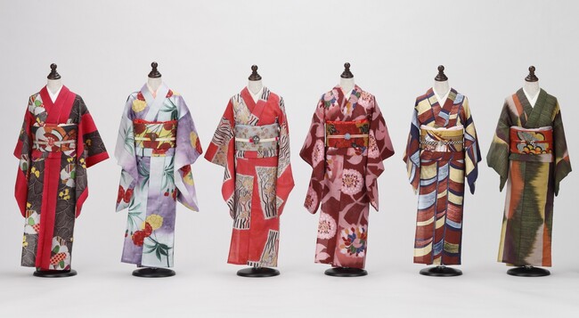 本展では、2021年に高島屋史料館(大阪)で開催した、高島屋創業190周年記念展「キモノ★ア・ラ・モード」における産学連携企画として大学生が制作したミニチュアキモノを展示。現存していない戦前の百選会の着物を、当時の着用写真や図案を参考に、インクジェットプリントで柄から再現。ミニチュアキモノに仕立てた着物を、1/2トルソーにフルセットで着付けを行います。