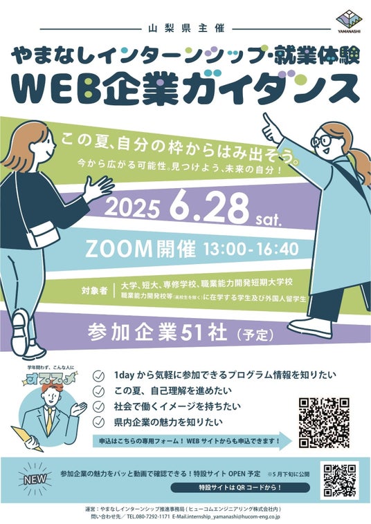 山梨県(知事:長崎幸太郎)は、山梨県内に本社又は事業所を有する企業でのインターンシップや就業体験を通じて、県内大学生等の県内就職や県出身大学生等のU・Iターン就職を促進するため、受入企業と学生とのマッチングを積極的に支援しています。