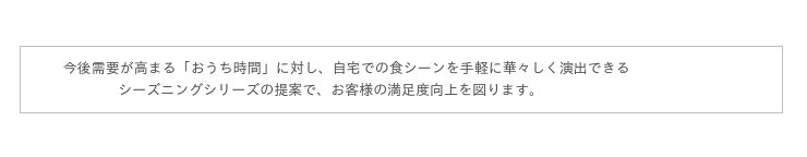 今後需要が高まる「おうち時間」に対し、手軽に素敵な料理を楽しめるFAUCHONシーズニングの味わいを強化することで、お客様満足の向上を図ります。