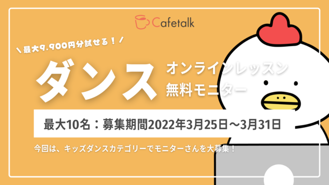 世界中の講師と生徒をつなぐオンライン習い事サイト「カフェトーク(http://cafetalk.com/)」を運営する株式会社スモールブリッジ(本社:東京都渋谷区、代表取締役:橋爪小太郎)は、オンライン/マンツーマンで実施されるキッズダンスレッスンをお試しいただけるモニター様10名を2022年3月25日~3月31日の日程で募集しています。