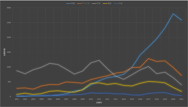 2012年までは日本が特許出願数で1位でしたが、2013年にアメリカに抜かれました。2015年以降は中国の特許出願が増加して出願数トップとなり、以降は中国が他国を大きく引き離しています。