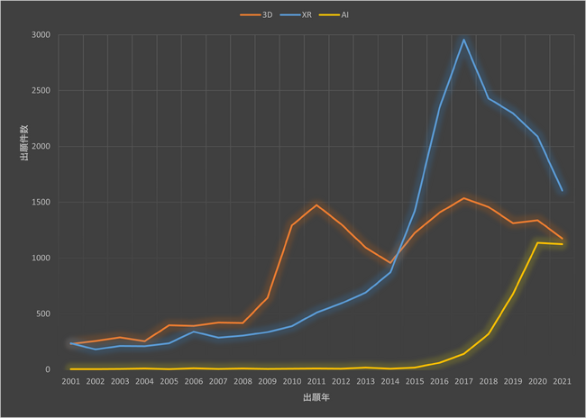 2001年以降、XRは約21,000件、3Dは約19,000件の特許出願があります。累計の出願件数は3DとXRでほぼ同程度ですが、3D技術は2010年以降、1年あたりの出願数が1,000件~1,500件程度でほぼ横ばいであるのに対し、XR技術は2015年に3Dを上回り、近年の出願件数が多くなっています。ただし、XRでの出願件数の増加も2017年に止まっており、3D、XRともに頭打ちの状態にあります。