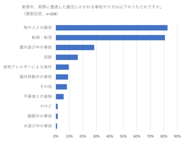 2.業務中、園児の事故やケガに遭遇した場面は、1位:「園児の物や人との物理的な衝突」(82.7%)、2位:「園児の転落・転倒」(80.8%)、3位:「園児の園外での遊び中の事故」(28.4%)、4位:「園児の誤飲」(16.3%)、5位:「園児の食物アレルギーによる発作」(9.6%)と続きました。