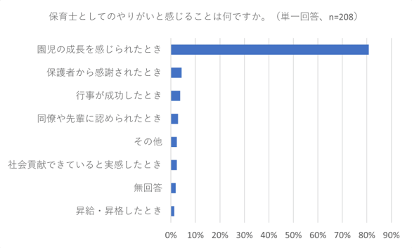 ・保育士としてのやりがいランキングでは、1位:子どもの成長を感じられたとき(80.8%)、2位:保護者から感謝されたとき(4.3%)、3位:イベントが成功したとき(3.8%)と「子どもの成長を感じられたとき」が目立った。