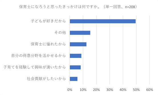 1.保育士になろうと思ったきっかけとして最も多かった回答は、「子どもが好きだから」が全体の約5割(49.5%)を占め、目立ちました。