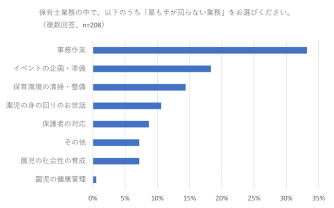 ・手が回らない業務は、事務作業(33.2%)、イベントの企画・準備(18.3%)、保育環境の清掃・整備(14.4%)の順となった。