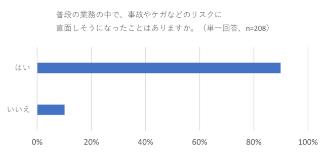 ・約9割が、普段の業務の中で事故やケガなどのリスクに直面しそうになったと回答。