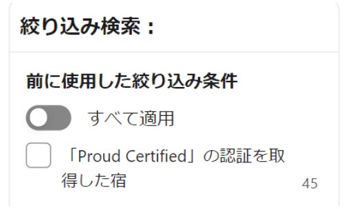 絞り込み検索から「Proud Certified」の認証を取得した宿をチェック