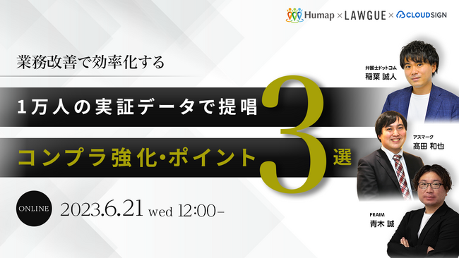 株式会社アスマーク(東京都渋谷区東、代表取締役:町田正一)は、2023年6月21日(水)12:00に「コンプライアンス」をテーマに、FRAIM株式会社と弁護士ドットコム株式会社の3社共催によるセミナーを開催いたします。