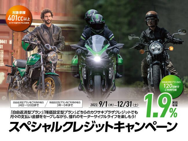株式会社カワサキモータースジャパン(本社:兵庫県明石市、代表取締役社長:桐野 英子)が展開するカワサキ プラザネットワークでは、2022年9月1日(木)~2022年12月31日(土)までの期間中、カワサキプラザで対象の401cc以上モーターサイクル新車をご購入時に実質年利1.9%でご利用いただける「カワサキプラザ スペシャルクレジットキャンペーン2022」を開催いたします。