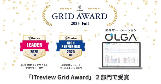 リーガルテックサービスを提供するGVA TECH株式会社(本社:東京都渋谷区、代表取締役:山本 俊、以下GVA TECH)が提供する法務オートメーション「OLGA」は、アイティクラウド株式会社が運営する「ITreview Grid Award 2025 Fall」にて「Leader」を受賞したことをお知らせいたします。