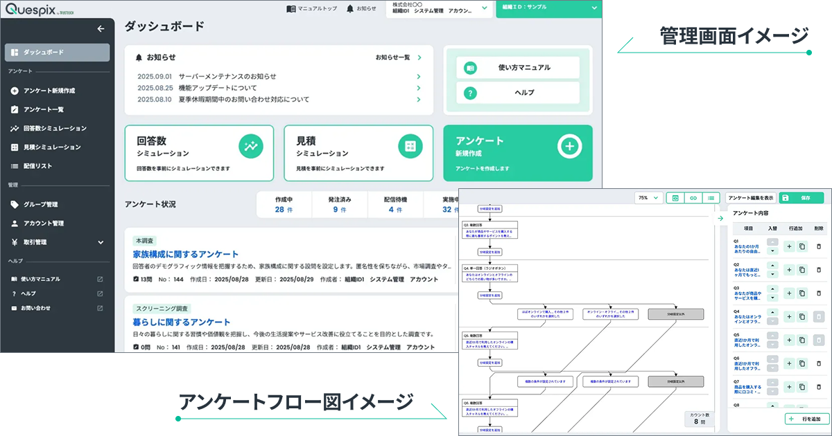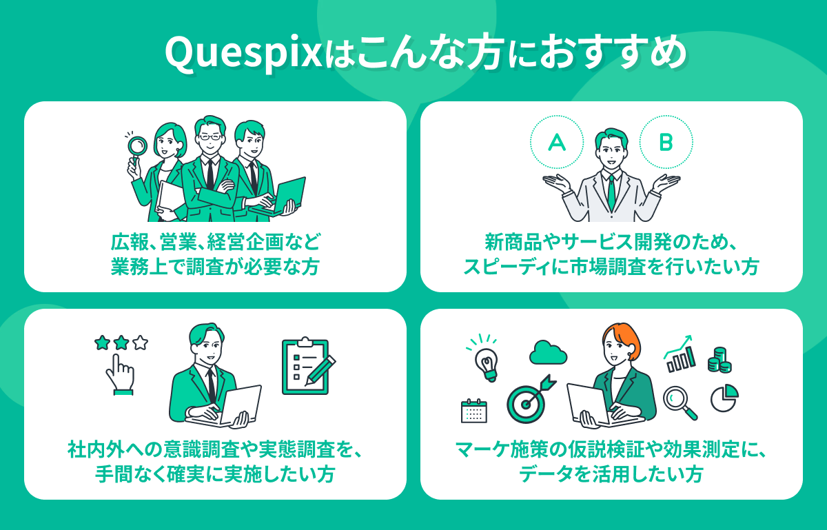 「Quespix」は、信頼性の高いモニターに対して、誰でも手軽に本格的なアンケート調査が実施できるセルフ型アンケートサービスです。セルフ型なので、スピーディーに、リーズナブルに、かつ柔軟なロジック設計でアンケート作成・集計・データ加工を行うことが可能です。