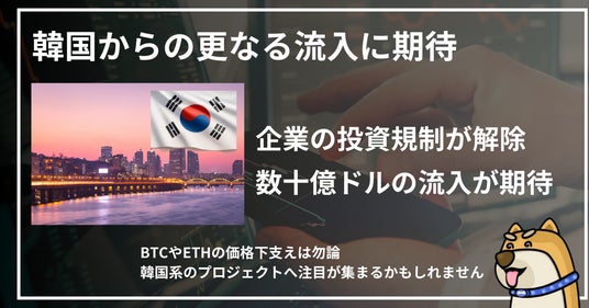 元々韓国では税制の面でも優遇されており、韓国の取引所に上場したら暗号資産が大きく価格上昇することでも有名です。今回の発表で個人投資家だけでなく、企業の購入という大きな流入が見込まれるようになるので、暗号資産業界にとってはとても大きな材料となります。