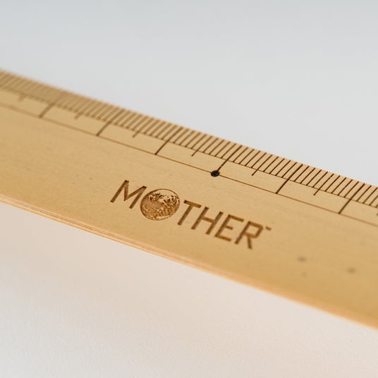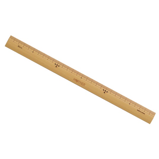 今回つくった「ものさし」は、国産の竹を材料にしています。材料も、きちんと選ばなければならないため、個数も限られ、個体差があります。しかしながら、そのようにして、天然の竹でつくられたものさしは、触り心地や、紙や布あたりがよく、つかい込むほどにツヤが増します。最後の仕上げとして1本1本に『MOTHER』のロゴを焼き付けています。
