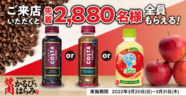 株式会社物語コーポレーション(本社:愛知県豊橋市/代表取締役社長:加藤 央之)が運営する『焼肉 かるびとはらみ』(埼玉県ふじみ野市)は、2022年3月20日(日)より、店内でご飲食いただいた先着2,880名のお客様に、「Costa Coffee ブラック」「Costa Coffee ラテ エスプレッソ」「Qoo りんご」の中からいずれか1本をプレゼントいたします。