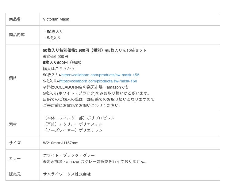 <楽天市場 Collaborn店>https://item.rakuten.co.jp/collaborn/sw-mask-158/