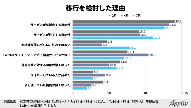 他SNSへの移行を検討したことがある人の理由を尋ねたところ、最多は「サービスが有料化する可能性(25.3%)」でした。過去2回の調査でも1位に選ばれています。