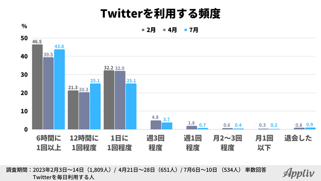 イーロン・マスク氏による買収以降、Twitterの仕様変更が相次いでおり、今後の動向に引き続き注目が集まっています。7月1日(現地時間)には事前予告なしに一時的な閲覧制限が行われ、多くのユーザーに混乱を招きました。Applivでは2023年2月よりTwitterの利用状況に関する調査を実施しており、4月に続き3回目となる調査の結果を公開します。