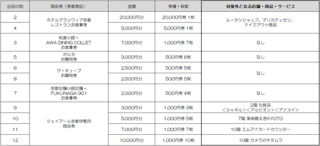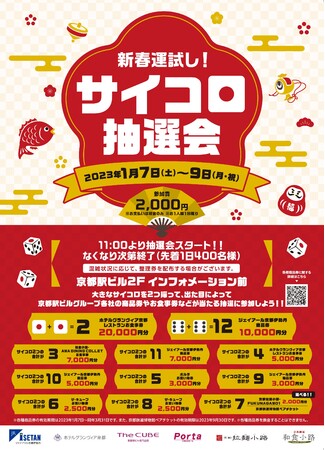 参加費2,000円で参加いただき、大きなサイコロ2個を振った出目の和に応じて、「ホテルグランヴィア京都レストランお食事券2万円分」など、京都駅ビルグループ各社の商品券等が当たります。