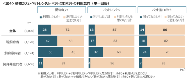 動物関連サービスについて利用意向を聴取した。犬、猫、自宅で飼うことが難しいフクロウやカワウソなどと触れ合える「動物カフェ」の利用意向は28%、一緒にお散歩したり泊まったりできる体験型の「ペットレンタル」は13%、問いかけに反応してくれるAI搭載タイプもある「ペット型ロボット」は14%であった。いずれも、今後ペットを飼いたい人(飼育意向者)と現在ペットを飼育している人(現飼育者)の意向が高い。特に飼育意向者の「動物カフェ」の意向は55%と半数を超える。<図4>