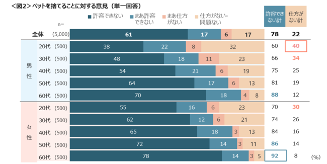 ペットが捨てられて繁殖し生態系への影響の懸念もある昨今、ペットを捨てることに関しての意見を確認した。捨てることに「許容できない」は61%、「まあ許容できない」は17%と合わせて78%と多くは許容できないとしている。特に50~60代の許容できない割合は高い。許容できない理由は、「命の大切さがわかっていない」「かわいいだけで飼うのが無責任」「周辺環境へ影響する」「捨てる以外の方法を検討してほしい」という声があがった。一方、「しかたがない・問題ない」は22%であり、男性20代、男性30代、女性20代は3~4割を占め若年層は高めであった。その理由は、「家庭事情やモラルなどから、ペットを捨てる人はいなくならない」「捨てる以外の方法が浸透していない」などである。<図2、3>