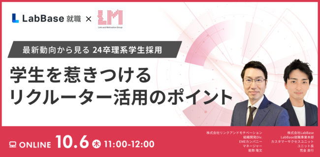 株式会社リンクアンドモチベーション(本社:東京都中央区、代表:小笹芳央、証券コード:2170、以下当社)は、株式会社LabBaseとの共催で開催する「理系学生を惹き付け採用に導くリクルーター活用」をテーマにしたセミナーについて、下記の通りお知らせいたします。