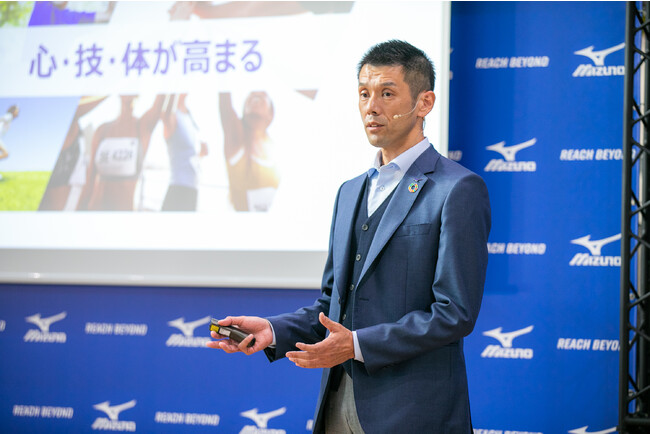 初めに、ミズノ株式会社 代表取締役社長 水野明人より設立の趣旨や「MIZUNO ENGINE」のネーミングについて、今後の未来に向けてのプレゼンテーションを行いました。社長の水野は、「消費者の皆さんや選手の皆さんが本当に喜んでいただけるようなものを開発して提供していくことが我々の使命」と述べました。つづいて、グローバル研究開発部 部長の佐藤より、イノベーションセンター「MIZUNO ENGINE」の中には、「はかるための専門施設やつくるための専門設備、ためすための色々な空間が全部詰まっている施設である」と説明などを行いました。
