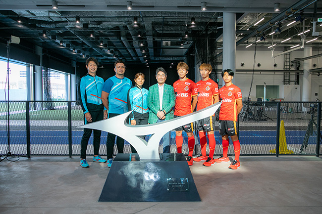 お披露目会では、ミズノ株式会社 代表取締役社長 水野明人による設立趣旨などの説明や、グローバル研究開発部 部長の佐藤から研究開発の展望である「MIZUNO MIRAI VISION(ミズノミライビジョン)」とイノベーションセンター「MIZUNO ENGINE」についてプレゼンテーションを行いました。その後、ミズノトラッククラブの短距離・飯塚翔太選手、短距離・兒玉芽生選手、やり投げ・ディーン元気選手、名古屋グランパスの永井謙佑選手、内田宅哉選手、甲田英將選手をお迎えし、施設内の測定機器を体験していただきました。
