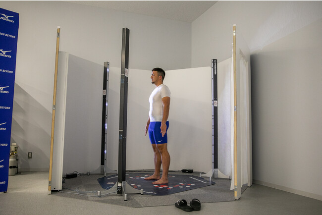 ミズノトラッククラブ ディーン元気選手は、3Dボディスキャナーで全身のサイズ測定を実施しました。スタートから0.5秒で測定完了し、体のサイズを測定することができます。ディーン選手は「肘周りが左右で2cmという大きな差があるんだな、実際に測っていただいて驚きました」「1mm単位でわかることはアスリートとしてありがたい」とコメント。