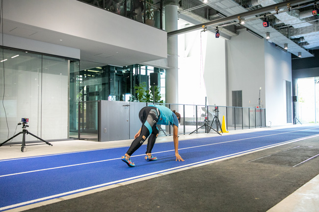 ミズノトラッククラブ飯塚翔太選手、兒玉芽生選手は、全長90mある走路を走り、走行時の全身三次元動作計測を行いました。
