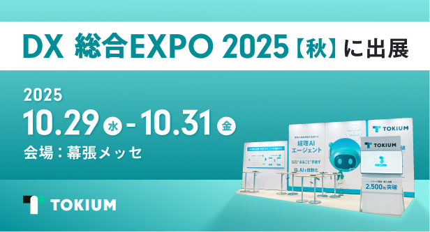 経理AIエージェントを提供する株式会社TOKIUM(本社:東京都中央区、代表取締役:黒崎 賢一、以下「TOKIUM」)は、2025年10月29日から10月31日までの3日間、幕張メッセで開催されるDX 総合EXPO 2025 秋 東京内の「業務改革 DX EXPO」「経理・財務 DX EXPO」に出展いたします。