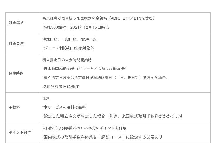 楽天証券株式会社(本社:東京都港区、代表取締役社長:楠 雄治、以下「楽天証券」)は、米国株式取引サービスを拡充し、2021年12月26日(日)より、円貨決済時に「楽天ポイント」(※1)を1ポイント=1円として、購入代金および取引手数料の全額または一部に利用できる「ポイント投資」サービス(※2)や、「米株積立」サービスなどを開始することをお知らせします。米国株式取引にポイントが利用できるのは、国内主要証券で初めて(※3)です。