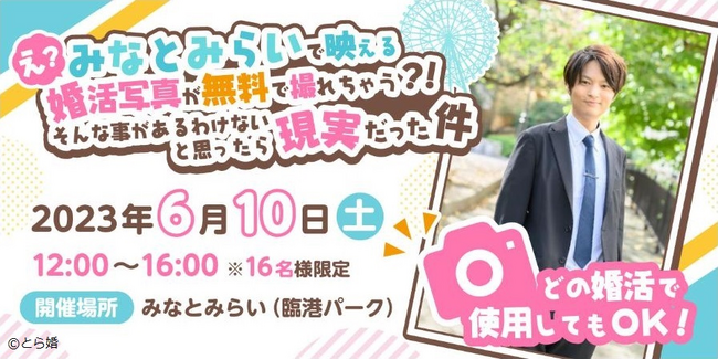 アニメやマンガ・ゲームなど趣味を愛するオタク層向けに特化した結婚相談サービスを展開するとら婚株式会社(代表取締役:吉田博高 以下、とら婚)は、とら婚 横浜オフィスにて2023年6月10日(土)の12時より、どなたでもご参加可能のプロカメラマンによる無料写真撮影イベント「え?みなとみらいで映える婚活写真が無料で撮れちゃう?!そんな事があるわけないと思ったら現実だった件」を開催いたします。