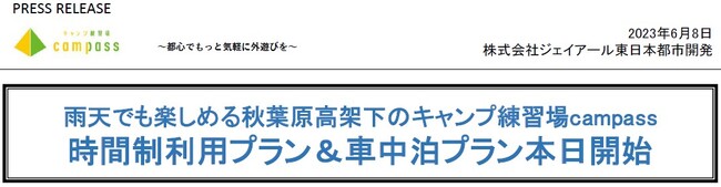 ◎(株)ジェイアール東日本都市開発は、「キャンプ練習場 campass(キャンパス)」を2023年3月19日より期間限定で、秋葉原の高架下で運営しています。本格化する梅雨時期に、雨に濡れないアウトドア体験をお楽しみください。