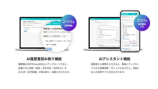 2025年2月には「AI履歴書読み取り機能」を提供開始。AIが履歴書の情報を読み取り「SmartHR」上の情報入力をサポートすることで、従業員一人ひとりの情報を手入力する人事労務担当者の業務時間が削減され、より付加価値の高い業務に時間を充てられます。また、2025年中には人事・労務に関する問い合わせをAIが回答する「AIアシスタント」機能の提供を予定しています。従業員は、自身に必要な人事・労務情報にいつでも簡単にアクセスでき、人事・労務部門は従業員からの類似・重複した問い合わせ対応を大幅に削減し業務効率化を実現します。