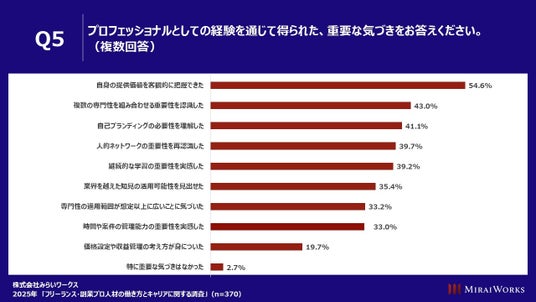 「プロフェッショナルとしての経験を通じて得られた、重要な気づきをお答えください」(n=370)と質問したところ、「自身の提供価値を客観的に把握できた」54.6%、「複数の専門性を組み合わせる重要性を認識した」43.0%、「自己ブランディングの必要性を理解した」41.1%などがあげられた。