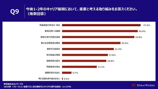 「今後1-2年のキャリア展開において、重要と考える取り組みをお答えください」(n=370)と質問したところ、「収益基盤の安定化・強化」47.6%、「新規分野への展開」45.9%、「既存の専門分野の深耕」43.8%などがあげられた。
