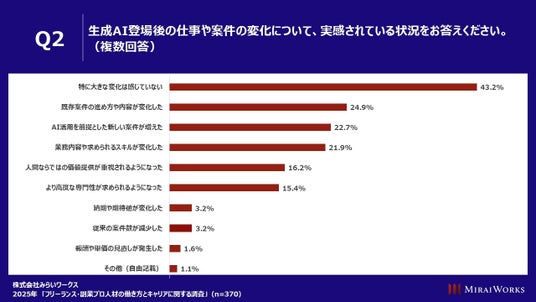 ■ 生成AI登場後の仕事や案件の変化について、「特に大きな変化は感じていない」が最大で43.2%
