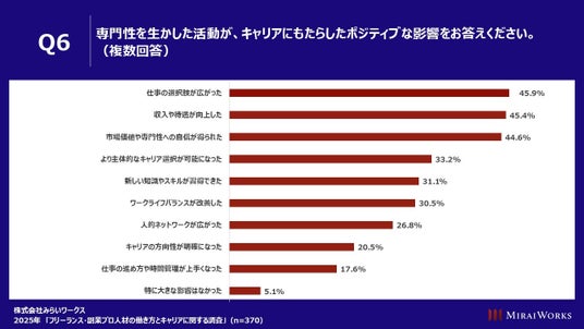 「専門性を生かした活動が、キャリアにもたらしたポジティブな影響をお答えください」(n=370)と質問したところ、「仕事の選択肢が広がった」45.9%、「収入や待遇が向上した」45.4%、「市場価値や専門性への自信が得られた」44.6%などがあげられた。