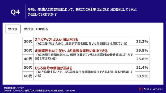 現在、生成AIを活用して仕事効率化や改善につなげているプロ人材は55.4%、自分の仕事にネガティブな影響はないと考えている人は65.4%、今後の影響については、年代ごとに特徴があり、20代は「スキルアップしないと淘汰される」、30代・40代は「定型業務をAIに任せ、より重要な業務に集中できる」、50代・60代は「むしろ自分の価値が高まる」と考えている人が最大数でした。