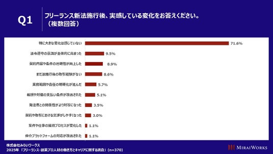 また、フリーランス新法施行後、契約内容や業務内容、報酬等の条件が改善しやすくなったと回答した人はいるものの、71.6%は「特に大きな変化は感じていない」ことがわかりました。